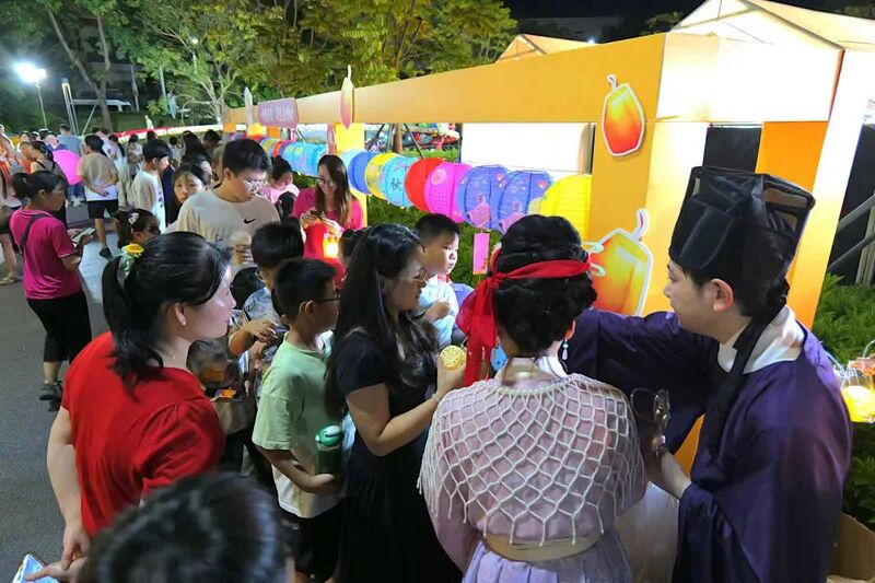 与此同时,中秋特别环节——“猜灯谜 领月亮”同样吸引了众多市民的目光。活动现场,身着汉服的NPC小姐姐与市民亲密互动猜灯谜。答对者即可领取一盏象征团圆的月亮灯,灯火映照下,人潮如织,欢笑如潮。