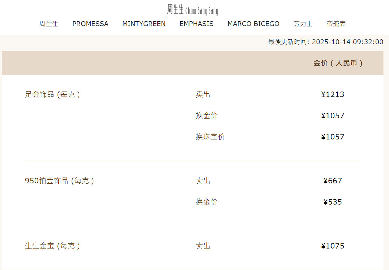 受国际金价影响,中国国内珠宝品牌足金首饰价格也出现上涨。14日,从已更新的情况来看,周生生足金饰品价格已涨至1213元/克。