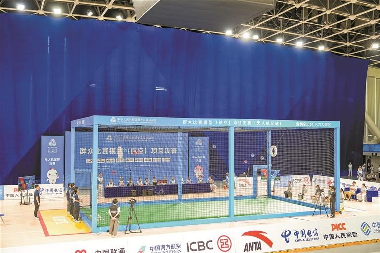 第十五届全运会群众比赛模型(航空)项目决赛无人机足球(F9A)团体小组赛(A组)比赛现场。