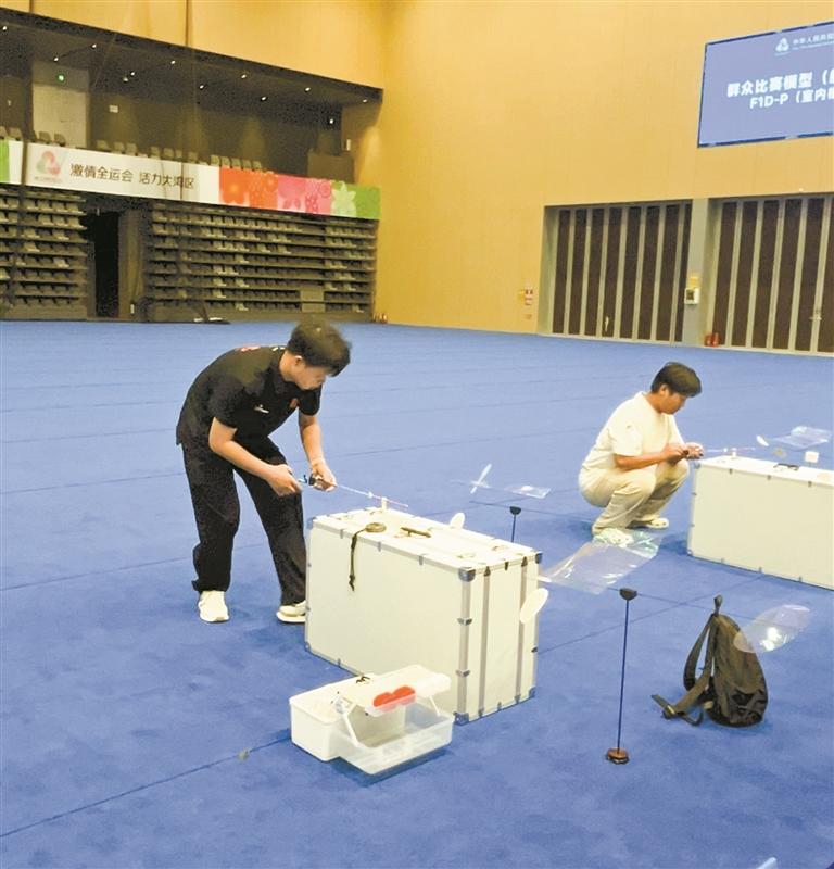 室内橡筋动力飞机属于自由飞行类航空模型中的一种。模型通过橡皮筋储存的能量,驱动螺旋桨使飞机产生升力,实现室内飞行。“模型只有1个硬币那么重,飞行时,任何一点参数变化,都会影响飞行成绩。”广东队运动员曾长泽介绍,自己在接触该项目时,已入手航模其他类型项目一年有余,两个月前,他开始接触室内橡筋动力飞机项目。他表示与其他航模项目不同的是,虽没有其他航模能提供飞行刺激感,但足够悠闲。“飞行前要花很长的时间调试模型,需要足够的耐心。但调试好后看到这些‘小精灵’在空中自由穿梭,很有成就感,我觉得这也是一种(别样)的乐趣。”