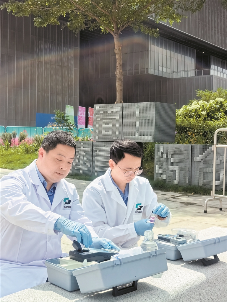 水质检测员对简上体育综合体周边水质进行抽样检测。