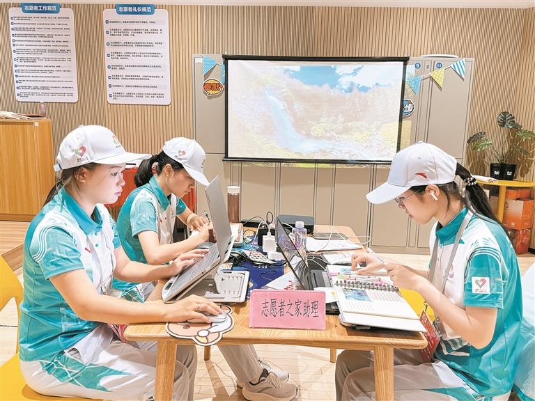 赛事服务的背后,是赛区对志愿者的全方位关怀。龙华赛区专门打造240平方米“志愿者之家”,公共休息区配备舒适座椅、充电接口与能量茶点,为志愿者提供基础保障。更贴心设置“文艺加油站”与影音区,电钢琴、尤克里里等乐器可供志愿者即兴演奏,高清投影仪可点播影视内容,让大家在服务间隙放松身心。此外,赛区还为女生设置专属休息区,配备日常用品,细节之处尽显温暖。“每次换岗回来都能快速恢复状态,这里像家一样贴心。”电子科技大学(深圳)高等研究院志愿者曹珂的感慨,道出了所有“小海豚”的心声。