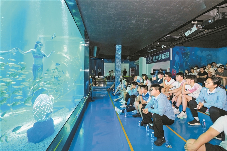 十五运会运动员在观澜海洋世界观看美人鱼表演《龙鱼奇遇记》。