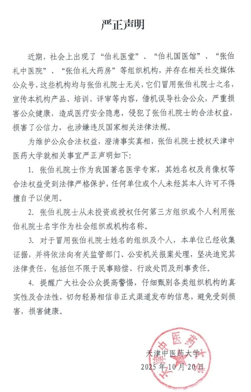 张伯礼院士授权天津中医药大学就相关事宜严正声明:张伯礼院士从未投资或授权任何第三方组织或个人利用张伯礼院士名字作为社会组织或机构名称。