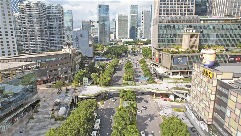 近日,记者在南山区后海商圈看到,一座长64米的天桥与深圳湾大街西段相接,原本分散的商圈如今因这座天桥而串联在一起,这将使市民购物游玩更加方便。