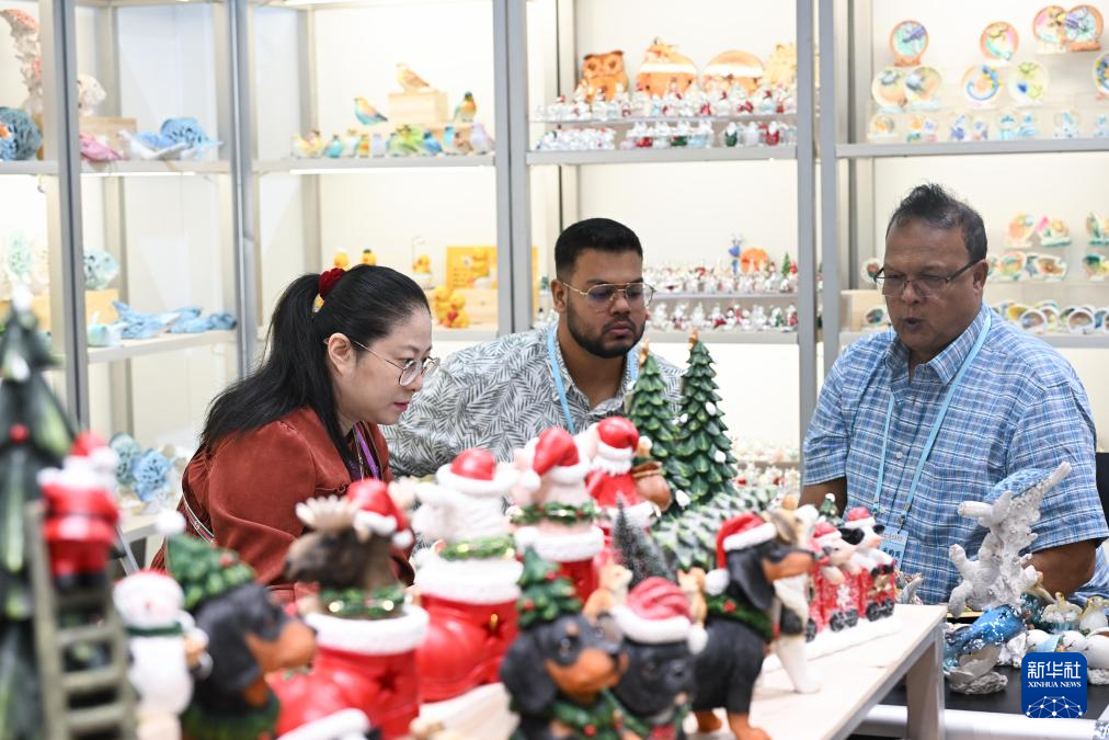 10月23日,境外采购商在礼品装饰品展台洽谈。
