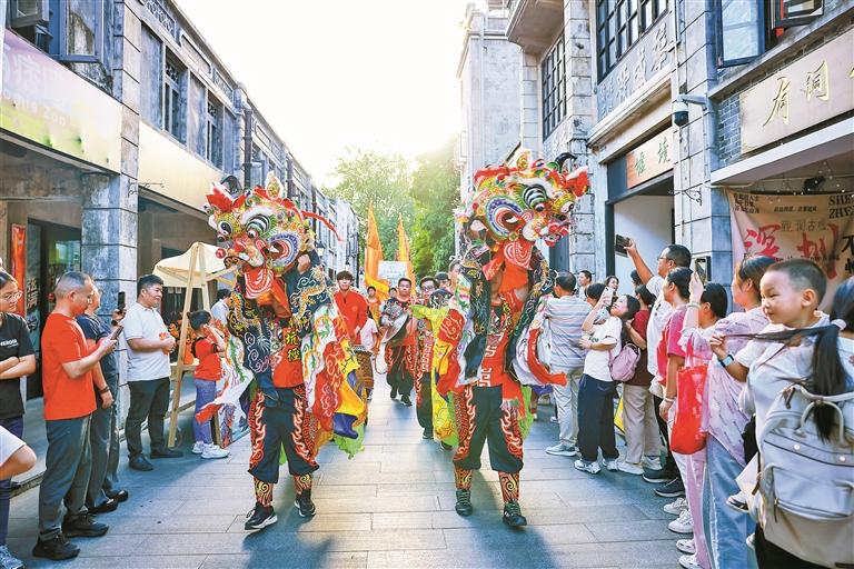 活动当日,古墟街巷人潮涌动,锣鼓喧天。色彩斑斓、造型威猛的麒麟在队员们的娴熟操控下,时而腾空跃起,时而俯身探步,动作刚劲有力,神态栩栩如生。每一支队伍都展现了独特的风格与精湛的技艺,或沉稳大气,或灵动活泼,将麒麟的喜、怒、哀、乐、惊、疑、醉、睡等神态演绎得淋漓尽致,引得沿途观众阵阵喝彩,掌声不断。古老的观澜古墟在现代麒麟的腾跃中,焕发出别样的文化魅力。展演活动还特别邀请了英歌舞和螳螂拳,现场还有客家非遗手作摊位等多种非遗元素与麒麟舞巧妙融合,增强居民对本土文化的认同与自豪感。