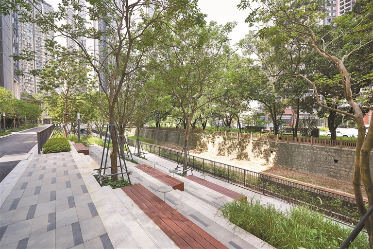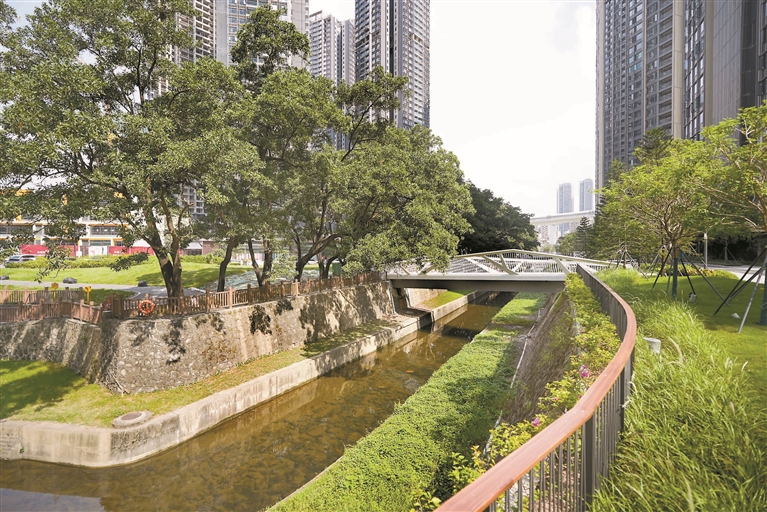 4号线“龙胜站”附近,深铁珑境项目建设热火朝天,而一旁的高峰明渠,正从昔日“三面光”传统水渠,蝶变为兼具亲水休闲与蓝绿生态功能的绿色岸线景观带。目前,这条滨水长廊已以“半成型”姿态初显雏形,不久后,周边居民下楼就能漫步河边、乐享亲水时光,在家门口拥抱“水绿相融”的惬意。