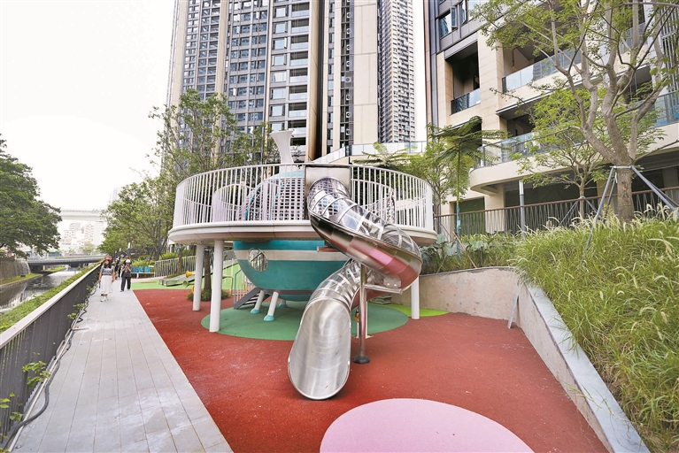 此次改造,龙华区水务局全程参与技术指导,从泄洪面规划到驳岸结构评估,逐一破解“排洪”与“亲水”的矛盾点;深铁置业承担资金投入与落地建设,最终确定分区域、分主题的设计方案,让水渠在保障安全的同时,兼具颜值与实用功能。覆盖近2万平方米,涵盖河道景观提升、设施建设及技术改造三大板块,小到绿植种植、步道铺设,大到儿童设施安装、水闸修建,每一项细节都经过政企双方反复研讨打磨。