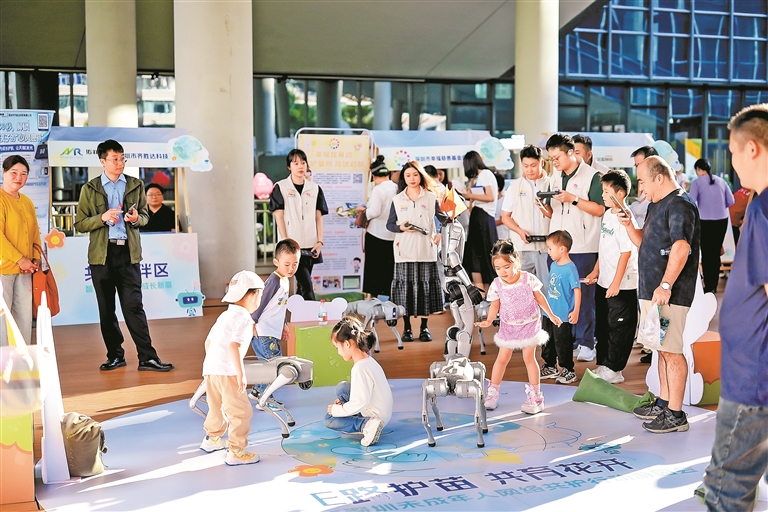 活动现场设立了“护苗成长区”“科技畅想区”“共护相伴区”三大主题区域,腾讯、华为、平安、荣耀、腾讯音乐、拓竹科技等企业汇聚一堂,秀出前沿创新成果,点燃了孩子们好奇的目光。
