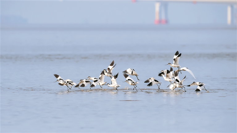 反嘴鹬在深圳湾戏水。通讯员 鹿向荣 摄