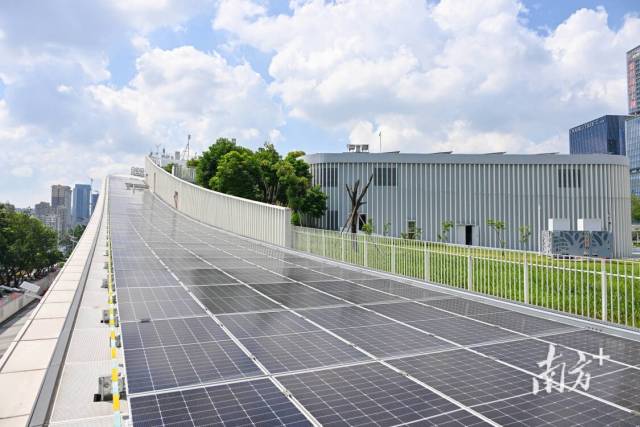 光伏也是省电费的大招,在多个建筑顶部、廊道上方都整齐排布着光伏板。“储能是存电,光伏是发了电直接用。”古志君介绍,光伏板安装时结合了建筑的形态,不影响风貌,目前共安装1600平方米,“光伏发电大约一年能帮场馆节省一个月的电费。”