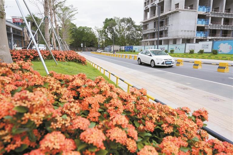 浪祥路沿线鲜花怒放、绿植葱茏,路面平整洁净。