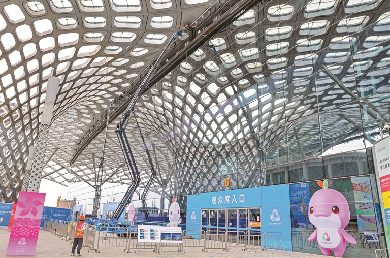 以“春茧”造型闻名的深圳湾体育中心,则向采访团展现了科技与绿色融合的另一种可能。据现场南山区赛委会有关负责人介绍,该场馆升级改造以“近零碳建筑”为目标,光伏建筑一体化技术成为最大亮点。场馆外立面的光伏玻璃既满足采光需求,又能将太阳能转化为电能,与智慧能源管理平台形成闭环,通过AI节能模式实现设备能耗的精细化管控。“我们打造了‘圳智慧’VOC数字孪生平台,结合开鸿技术实现鸿蒙物联场景联动。”工作人员通过移动端即可远程调控灯光、空调等设备,赛事期间的场地照明、扩声系统均已升级至国际顶级赛事标准,全新铺设的FIBA认证运动木地板为运动员提供专业保障。