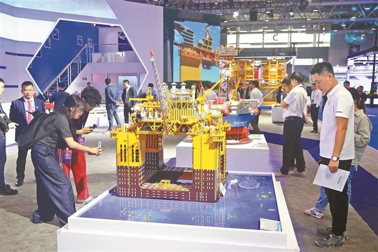 7号馆内,招商局等龙头企业深耕港航物流与基建;深圳移动打造5G等新型海洋信息基础设施;深圳联通展示海上安全等全栈式解决方案。华为、震兑工业、智慧海洋、朗诚科技、深蓝技术、中科探海等展示了在海洋电子信息、水下机器人、海洋生态监测等领域的国家专精特新技术和产品。5号馆内,海洋能源产业链元素丰富,中国海油“深水舰队”的高端海工装备与勘采技术,中集集团的多个“全球首个”光伏平台新品,深圳能源集团等展示海上风电、海水制氢等前沿技术,鞍钢等企业的高性能海洋新材料首发等,吸引众多专业观众商洽。