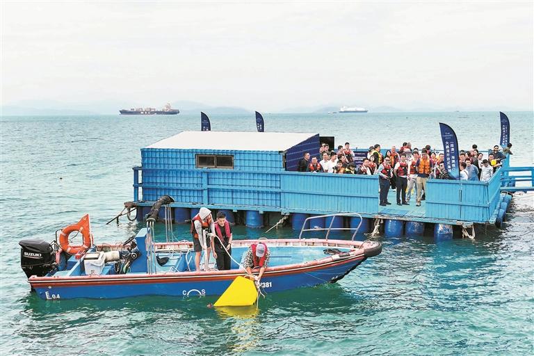 “水池造得再好,模拟环境再真,都不如真的下海试试。”深圳市海洋声光探测技术及装备工程研究中心主任李剑平说。当日9时,近20款海洋科技产品齐聚畲吓湾,水生态环境多模态监测系统实时捕捉海洋浮游生物种类和数量变化、监控平台和仪器的运行状态,同步获取水域温度、盐度、溶解氧等数据;海底实时在线监测监控系统如同“水下直播间”全天候实时呈现海底珊瑚、渔礁情况。