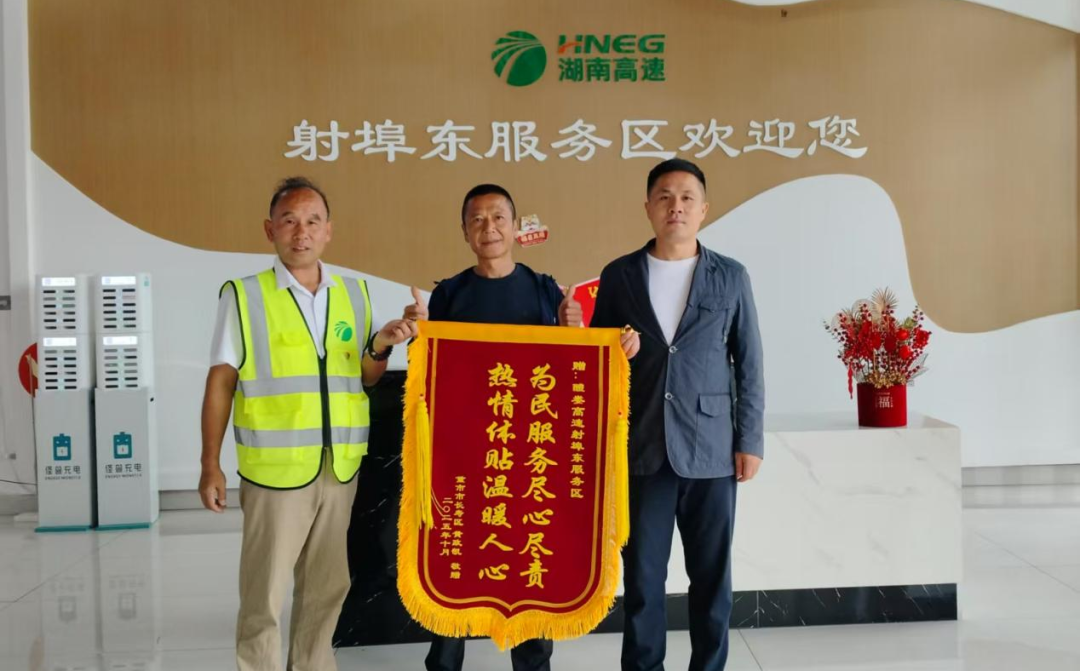 10月13日,来自重庆的货车司机黄师傅专程赶至射埠东服务区,将一面锦旗交到工作人员手中,言语中满是感激。