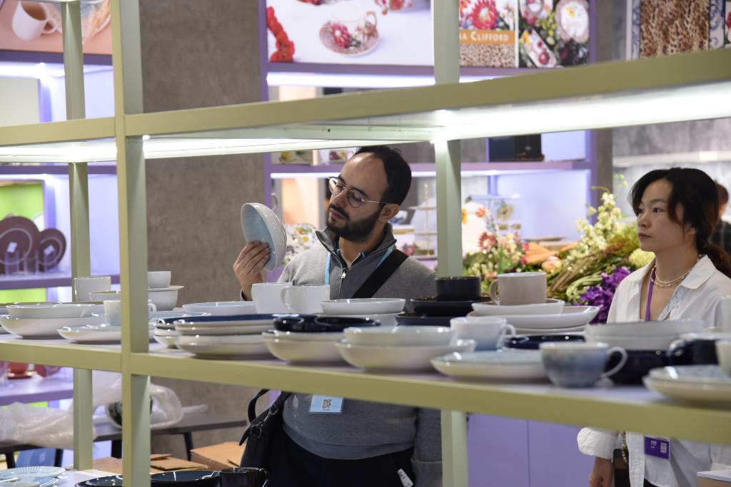 10月27日,采购商在第138届广交会第二期展会上查看瓷器餐具产品。新华社记者 洪泽华 摄