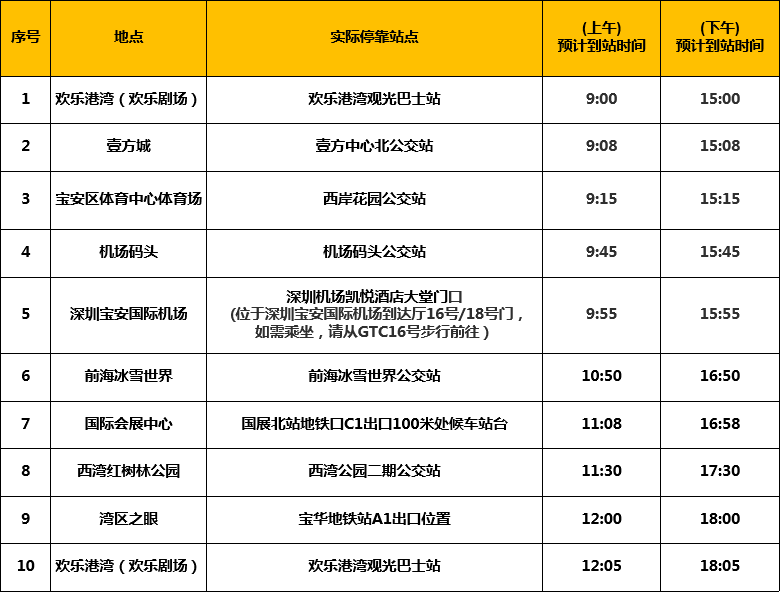 欢乐港湾(欢乐剧场)→壹方城→宝安区体育中心体育场→机场码头→深圳宝安国际机场→前海冰雪世界→国际会展中心→西湾红树林公园→湾区之眼→欢乐港湾(欢乐剧场)
