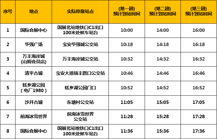 国际会展中心→华强广场→万丰海岸城(山姆会员店)→清平古墟→蚝乡湖公园(电厂1980)→沙井古墟→前海冰雪世界→国际会展中心