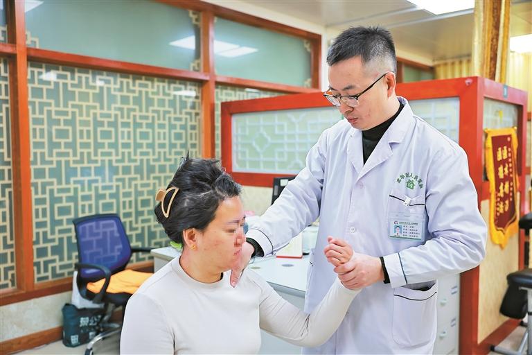 龙园社康中医漆勇为患者进行正骨推拿。