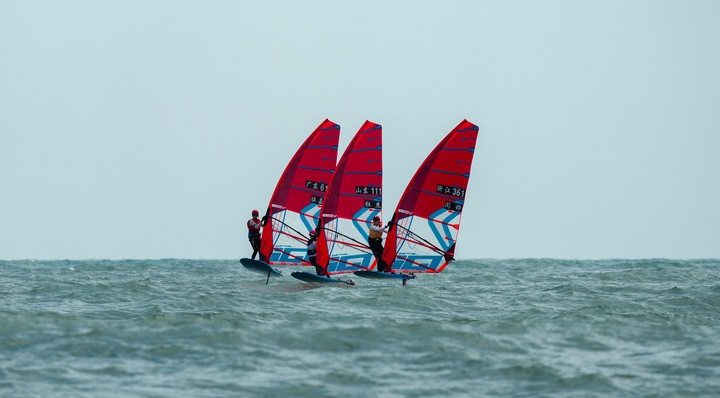 10月30日,浙江队选手闫铮(右)在第十五届全运会帆船项目女子水翼帆板级比赛中。新华社记者 晋美多吉 摄