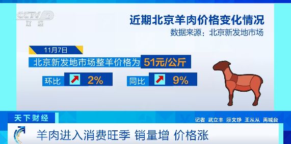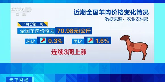 据农业农村部监测,11月份第一周,全国羊肉价格为每公斤70.98元,环比上涨0.3%,同比上涨1.6%,已经是连续3周上涨。