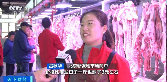 北京新发地市场商户 吕秋华:销售量增长20%,价格比之前一斤涨3元左右,羊腿现在有33元一斤、35元一斤的,前段时间是30元一斤。