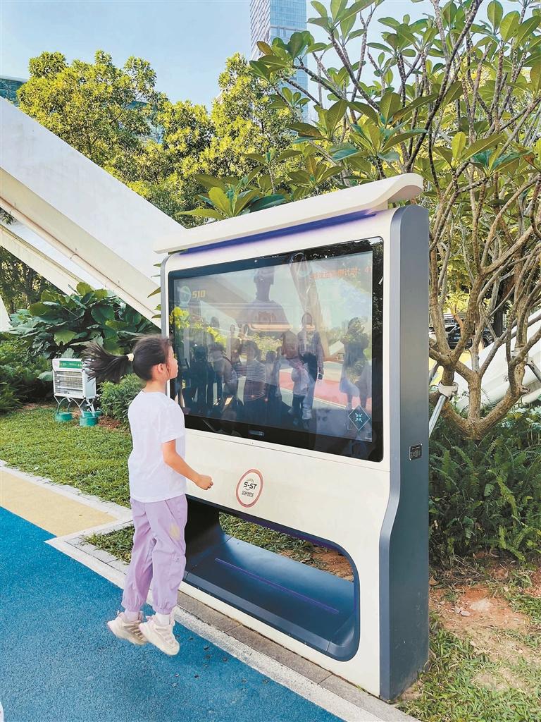 靠近体育公园南门的AR互动大屏前,8岁的紫萱带着弟弟妹妹跳起来挥舞双臂,随着肢体动作屏幕上的西瓜被“切开”,音视频效果让他们欢呼雀跃。“同样的切西瓜游戏比手机上玩好多了,又能锻炼身体又有助于摆脱手机依赖。”他们的妈妈拉着露营车,笑眯眯地看着孩子们玩。
