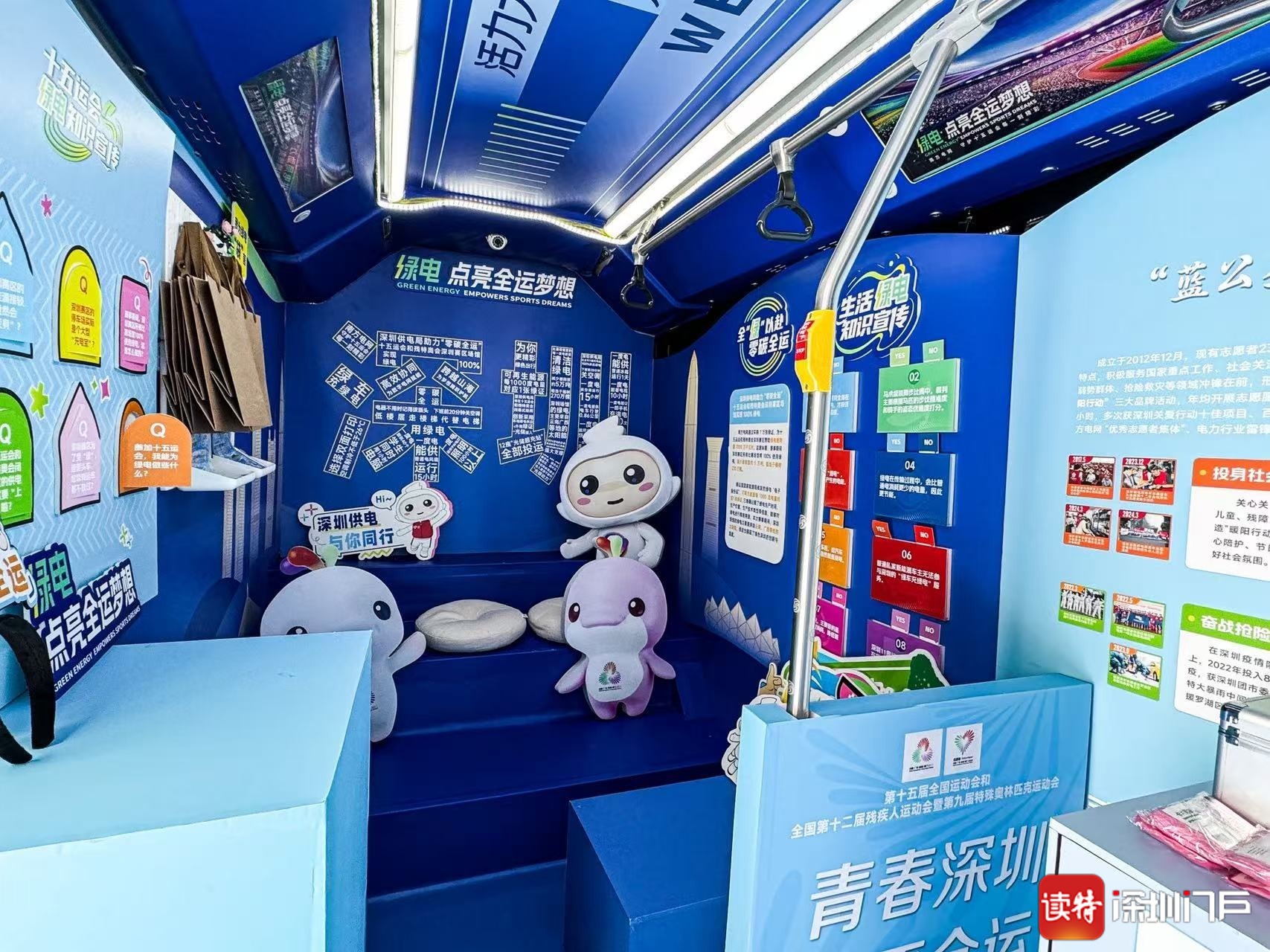 探访期间,一辆名为“南网蓝公益·情深”的绿电大篷车闯入视线。这个“可移动的电力科普志愿服务站”,在赛事期间穿梭于深圳赛事的各个热点区域。
