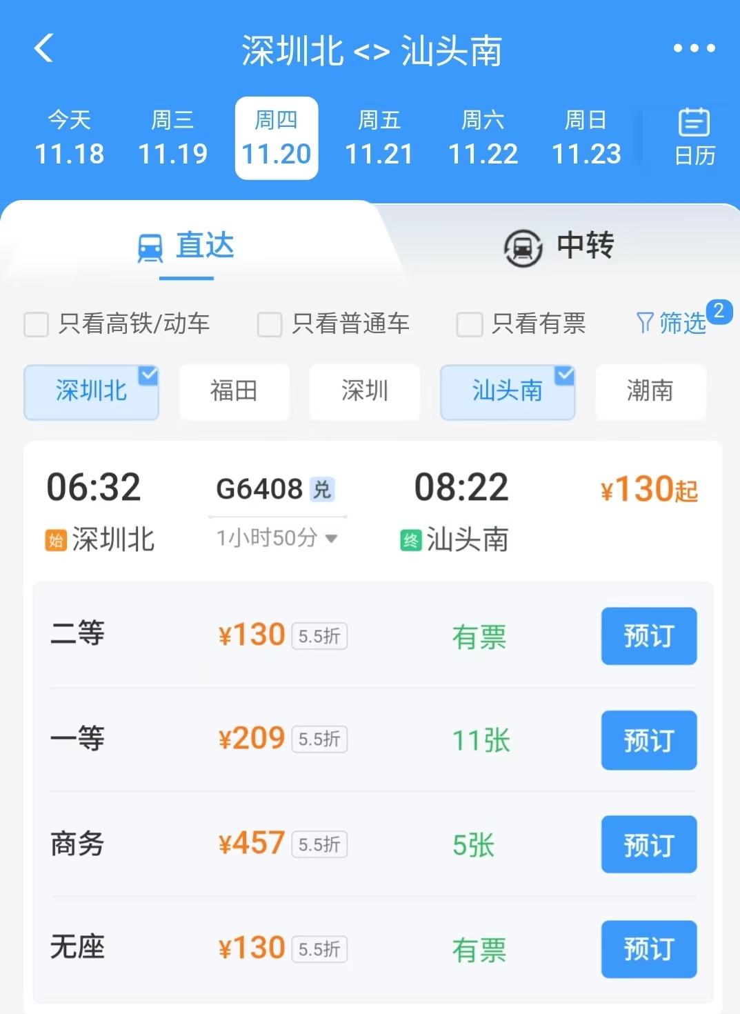 据了解,本次票价调整遵循灵活适配原则,深圳铁路根据区域、时段分布与出行需求特征,实施精细化、差异化折扣策略。以京港高铁赣深段、甬广高铁汕新段为例,铁路部门在早高峰通勤时段投放了多班低折扣车次,如清晨6:32由深圳北开往汕头南的G6408次列车,执行5.5折优惠,二等座票价130元;开往惠州北方向的G6324次列车执行7折优惠,二等座票价37元,切实降低跨城通勤成本,助力“轨道上的大湾区”建设。