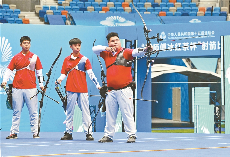 11月19日,十五运会射箭男子反曲弓团体铜牌赛在深圳体育中心体育场落下帷幕。深圳籍运动员林良文与队友袁权森、刘浩然组成的广东队,在铜牌争夺战中以5∶4力克劲旅湖北队,为广东代表团再添一枚宝贵铜牌。