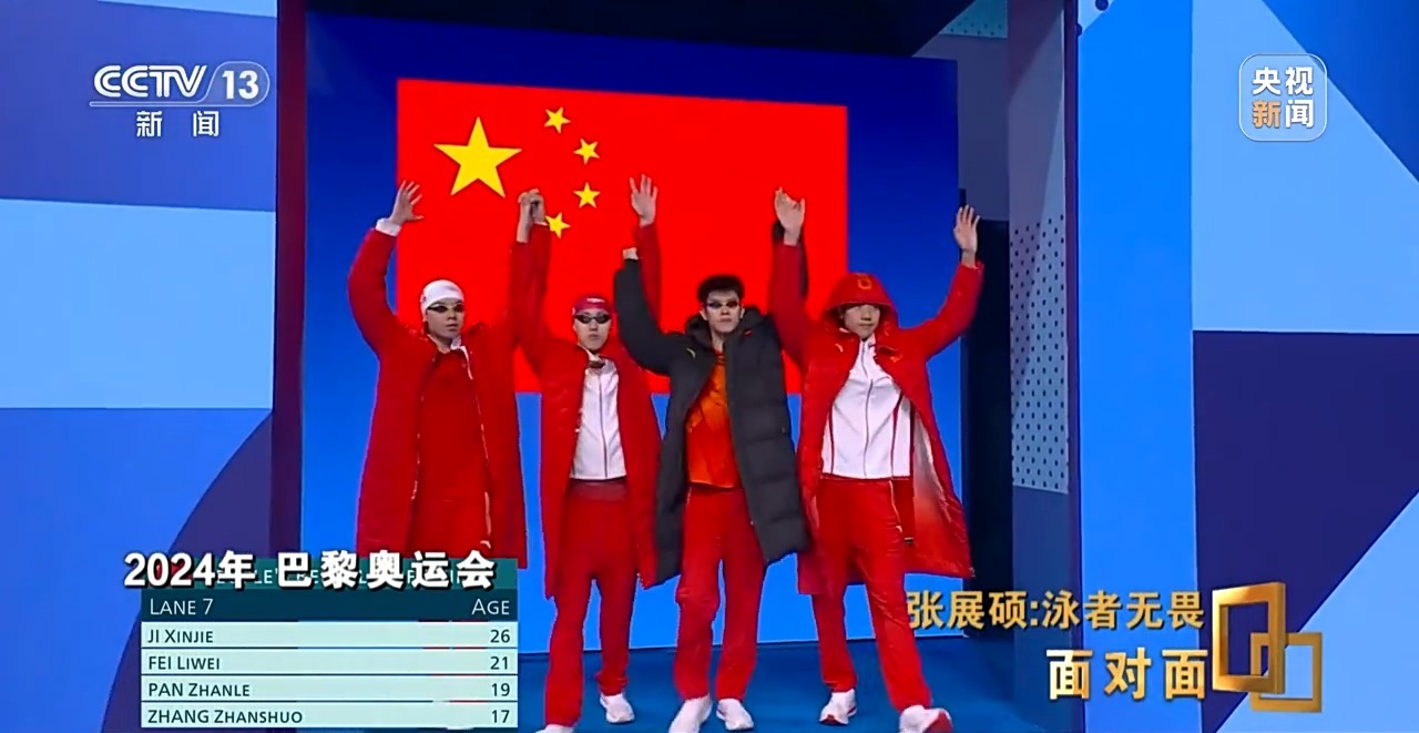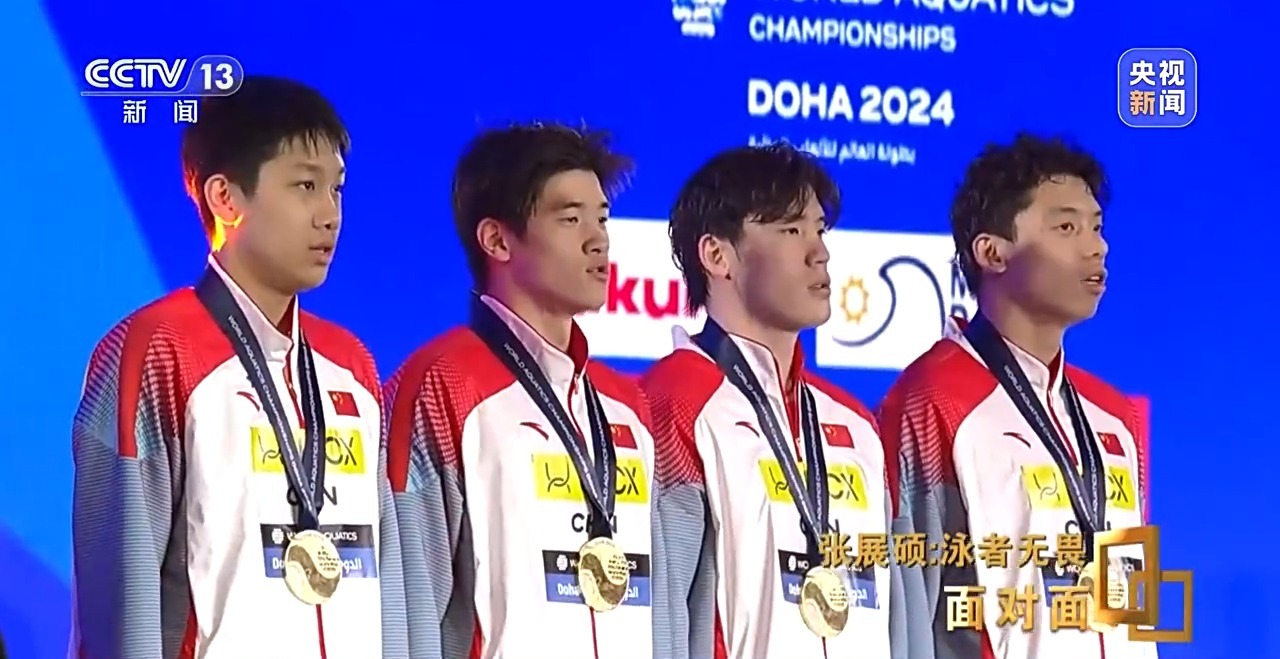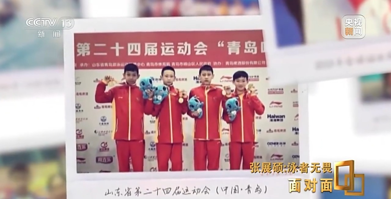 张展硕:我在出发台上腿都是抖的。因为我当时是我们这四个人中游得最慢的一棒,我不能拖大家的后腿。