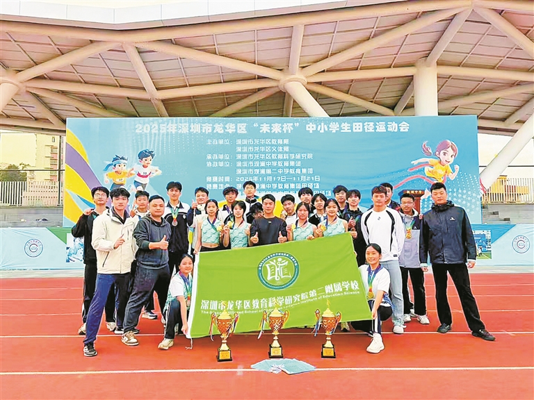 日前,龙华区2025年中小学生田径运动会落下帷幕。龙华区教科院第二附属学校校田径队以156分的绝对优势强势登顶,一举包揽男子团体、女子团体及总分三项冠军,为学校赢得了沉甸甸的荣誉。从2023年初赛的“零分败北”,到2024年斩获季军的历史性突破,再到2025年夺得团体三项冠军,离不开一群少年三年的坚持与付出。