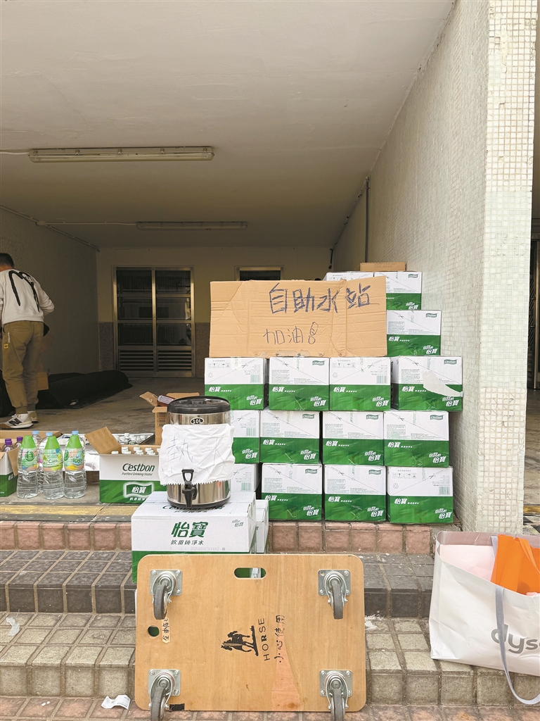 香港大埔冯梁结纪念中学设立的临时庇护点内,许多市民自发为在此安置的受灾居民分发物资、提供协助。负责物资管理的何先生向记者表示,他从11月26日下午4点起便一直守在现场,在这期间有许多市民前来提供饮料、食品和衣服等物资。据介绍,到27日上午,有四五十名义工主动加入,为有需要的附近居民分发物资。