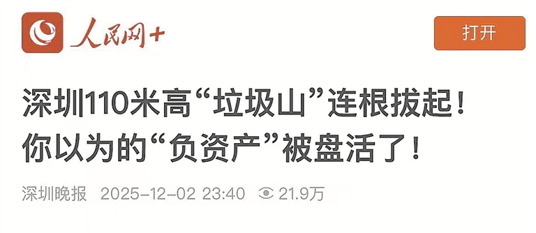 “前瞻经济学人”发布推文:“‘清空一座垃圾山,崛起一座未来城。’这不只是一个项目的口号,更代表了一种新的城市哲学:没有什么‘废弃物’,只有尚未被重新发现的价值;没有什么‘负资产’,只有等待被重新定义的空间。”在众多城市面临“垃圾围城”、土地资源环境约束等困境之际,深圳这次破题体现了先行示范区的责任担当,在全国具有示范引领作用。