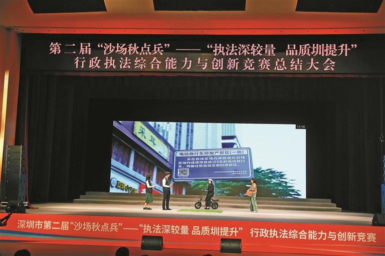 据了解,本次竞赛由市委组织部、市司法局联合主办,设置“场景式”执法竞赛决赛、“行政执法监督典型案例”、“坚守执法二十年”荣誉表彰评选等重要环节。在“场景式”执法竞赛决赛中,龙华区代表队以《“电驴”去哪了——一头电驴的归位之旅》为主题,围绕地铁站周边“停车乱、治理难”的真实困境,通过居民李大海从“违停者”转变为“劝导者”的故事主线,清晰展现了“规则宣传—集中整治—志愿引导”的全流程治理路径,生动刻画了龙华区如何以规则引领结合AI 3D技术,创新治理电动自行车违停问题,推动市民从“被动守规”到“主动参与”,携手共建有序城区。龙华区代表队精彩的演绎,引来阵阵掌声,最终在决赛12支队伍中,以全市第三名的成绩获评场景式执法二等奖。