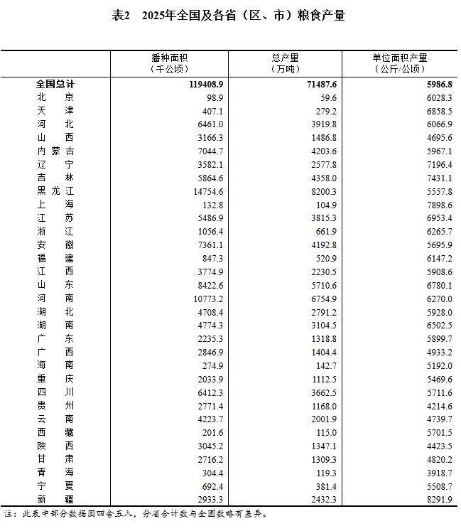 根据对全国31个省(区、市)的调查,公布2025年全国粮食播种面积、单位面积产量和总产量。