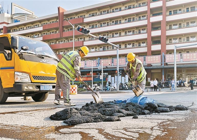 12月9日,道路养护队伍到场铺设应急沥青。 深圳晚报记者 石耿珲 摄