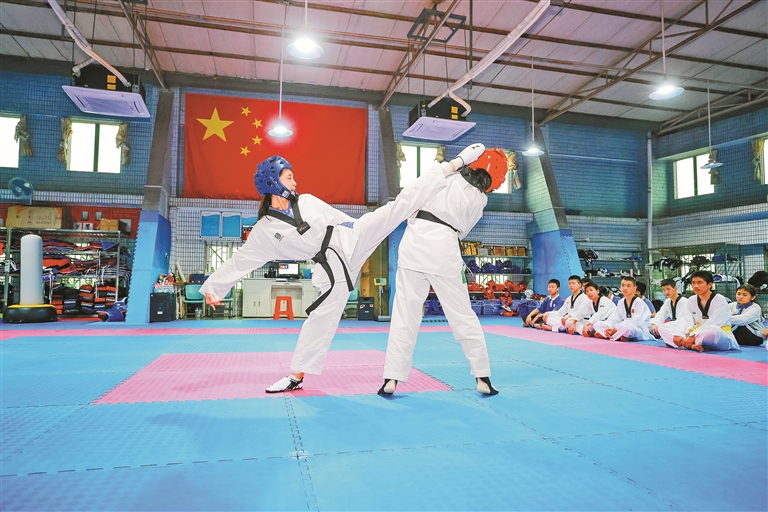 ▲观澜中学的学子们进行跆拳道基本功训练。