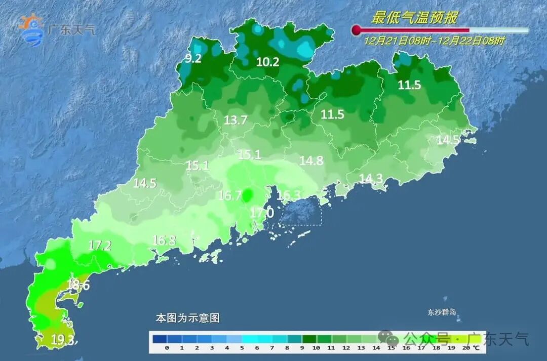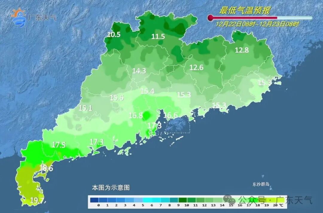 22日,广东省南部市县晴转多云,局部有零星小雨,其余市县多云到晴,早晨部分市县有轻雾或雾。最低气温:韶关、清远北部、河源北部、梅州北部市县8~11℃,珠三角南部和粤西沿海市县15~19℃,其余市县11~15℃。