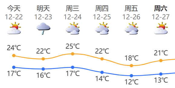 周一(22日)晴天到多云,气温16-24℃,沿海、高地和海区最大阵风7级左右;