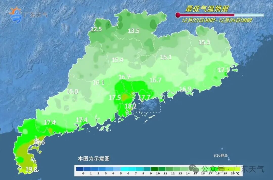 23日,广东省中东部市县多云到阴天,有小雨,其余市县多云,局部有小雨。最低气温:韶关、清远北部、肇庆北部、河源北部、梅州北部市县11~13℃,珠三角中南部和粤西沿海市县17~20℃,其余市县13~16℃。