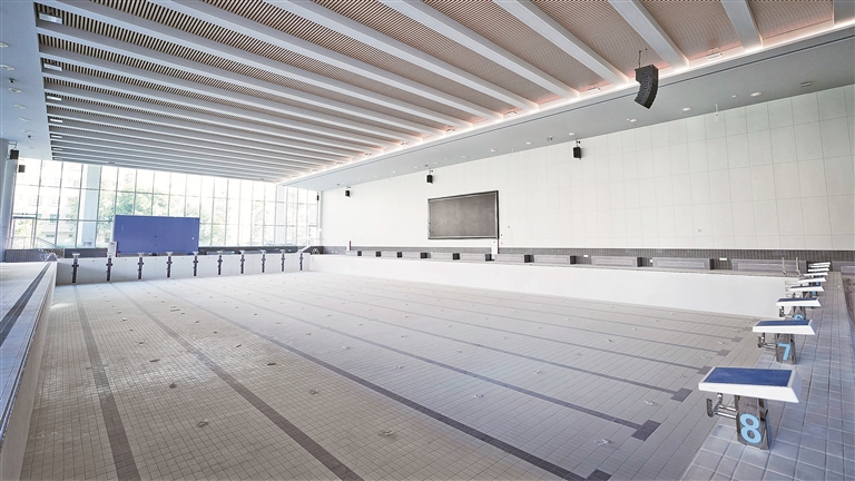 首层堪称“运动活力核心区”,这里设有2171个座位的多功能馆,可灵活承办各类中小型体育赛事与文艺活动;还有1个室内标准游泳馆、1个室外训练池与1个儿童泳池构成完善的水上运动矩阵,满足不同年龄段市民的游泳需求;1个包含21片球场的室内羽毛球馆则成为此项运动爱好者的热门选择。值得一提的是,这里还有一座约1000平方米的真冰场,可为周边居民带来独特的运动体验。在主场馆的另一边,还有专门为滑板爱好者打造的滑行区域。