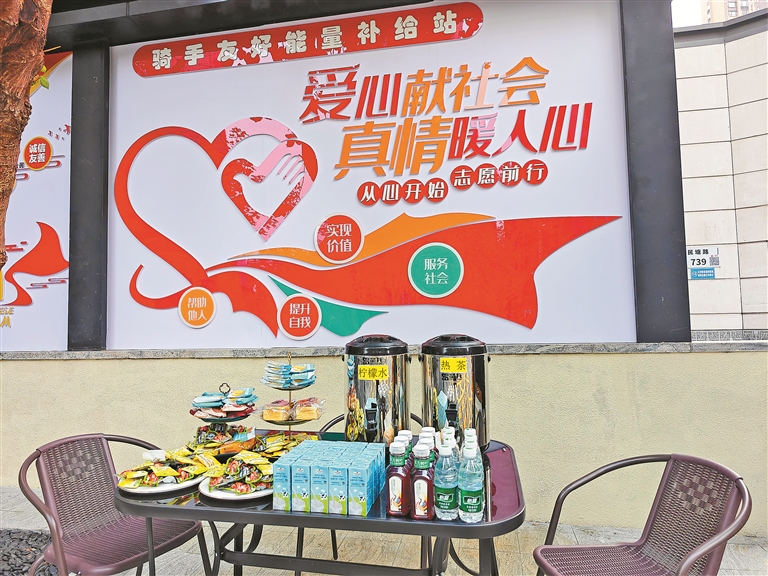 ▲红色文化墙前的“骑手友好能量补给站”。