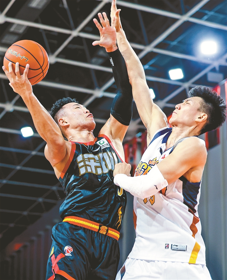 12月24日,深圳马可波罗队球员贺希宁(左)在比赛中上篮。 新华社发