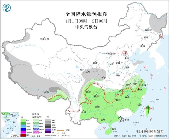 1月1日08时至2日08时,新疆西部山区、西藏大部、黑龙江东部、甘肃南部、西北地区东北部、川西高原北部、山东半岛、江淮等地部分地区有小到中雪或雨夹雪。江南、西南地区东部、华南西部、海南岛、台湾岛等地部分地区有小到中雨。渤海、渤海海峡、黄海、东海、台湾海峡、台湾以东洋面、巴士海峡、南海大部海域将有6~8级、阵风9~10级的偏北或东北风。