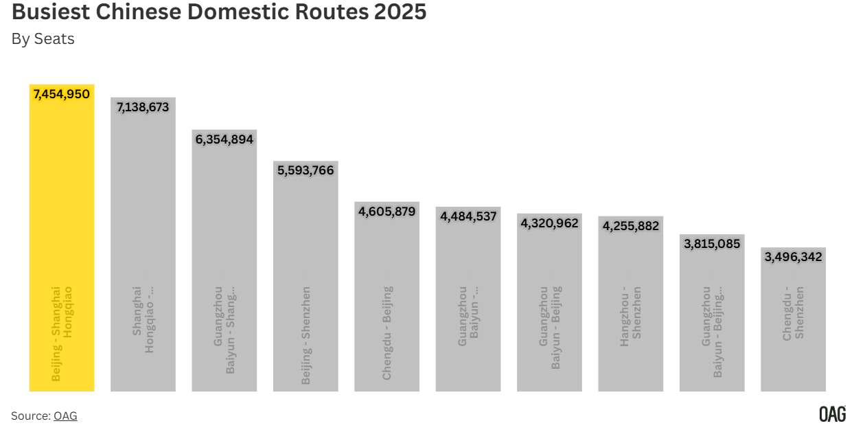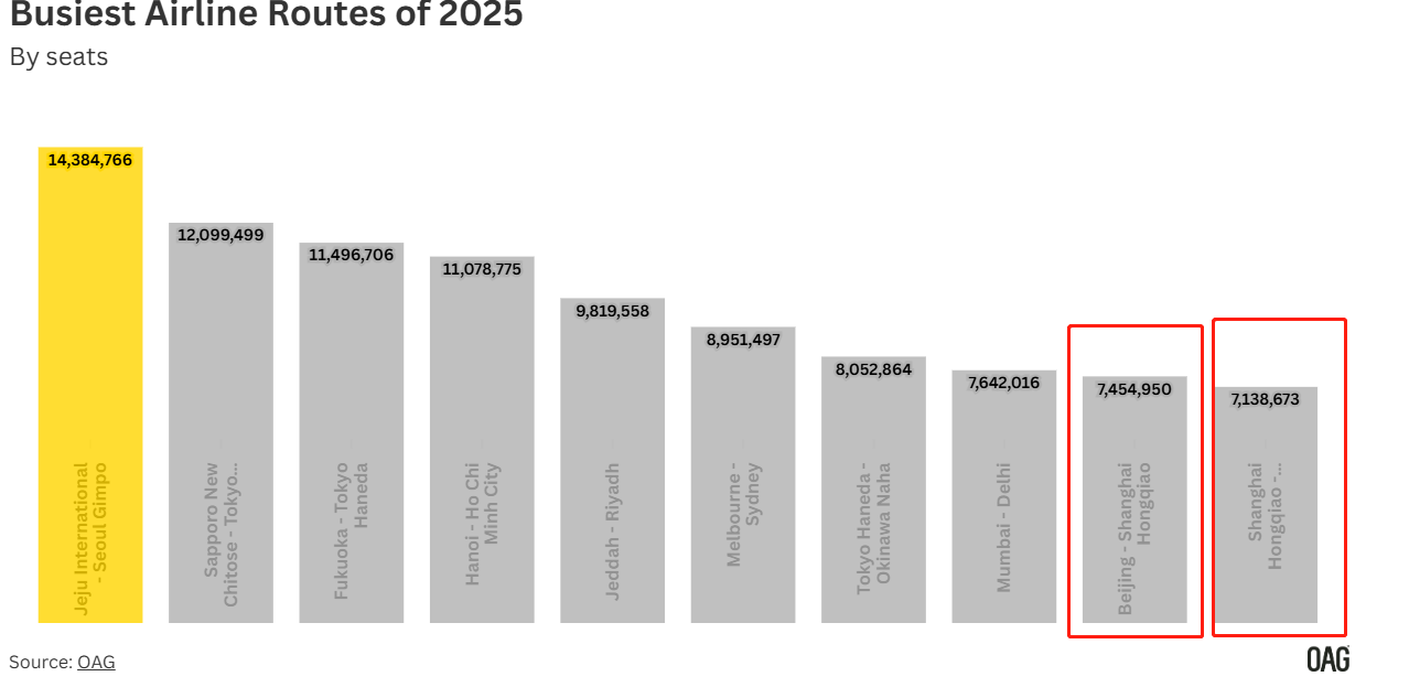 而在这份全球顶级航线榜单中,中国两条航线的表现尤为亮眼:北京首都-上海虹桥,以750万个座位位列第九;上海虹桥-深圳,以710万个座位首次跻身前十,排名第十。
