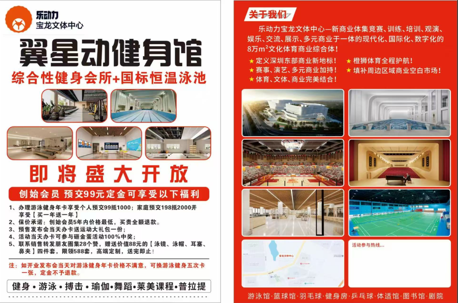 苏女士提供的宣传册显示,这家进驻宝龙文体中心的健身房名为“翼星动健身馆”,名字下方标注着“综合性健身会所+国际恒温泳池”以及“即将盛大开放”的字样。宣传册还显示,创始会员预交99元定金可享受一系列福利,包括办理游泳健身年卡享受个人预交99元抵1000元,家庭预交198元抵2000元并享受买一年送一年等。