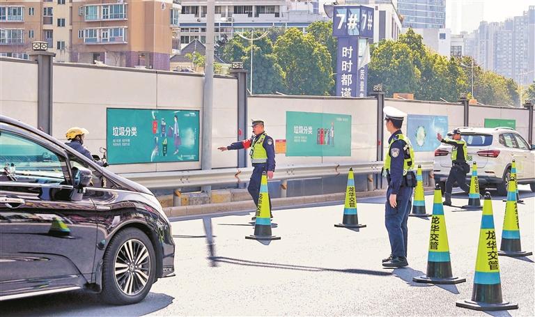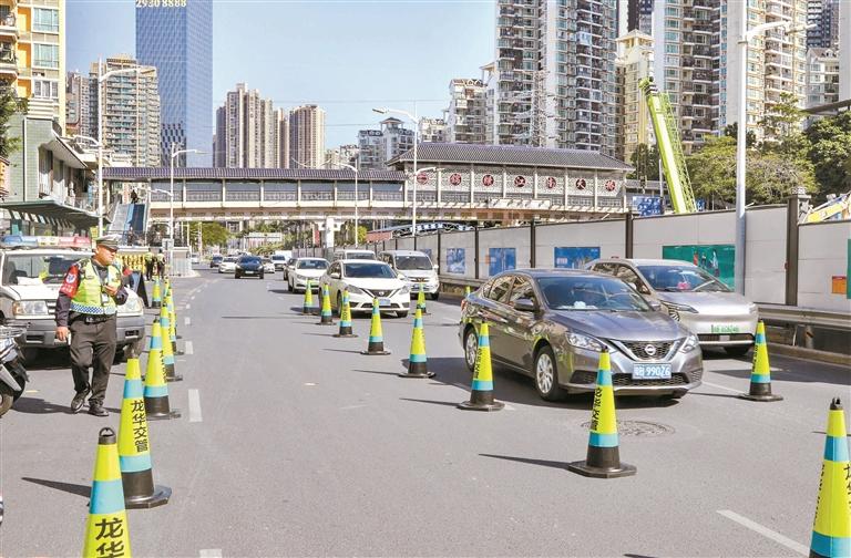 交警采取“链路式”执法模式,在龙华大道对电动自行车违法行为进行查处。